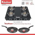 Khaitan Gas Stove Combo – One 4 Burner Active Forge Black Toughened Glass Gas Stove + 1 unit HF Dosa Tawa 250 mm + 1 unit HF Fry Pan 230 mm