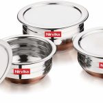 stainless steel handi set Copper Bottom handi/Urli Set with Lid Cookware Set (Stainless Steel, Copper, 3 – Piece) Induction Bottom Cookware Set/tapeli/pateli/patila/bhagona/milk biryani pot pan/serving bowl size:-1.5 L, 1.2 L, 1.00 L