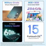 Dimensity 6300 5G Processor with 433K+* AnTuTu Score – A highly power efficient 6nm chip with CPU speeds upgraded to reach 2.4 GHz delivering a lag-free everyday experience with low power consumption.
